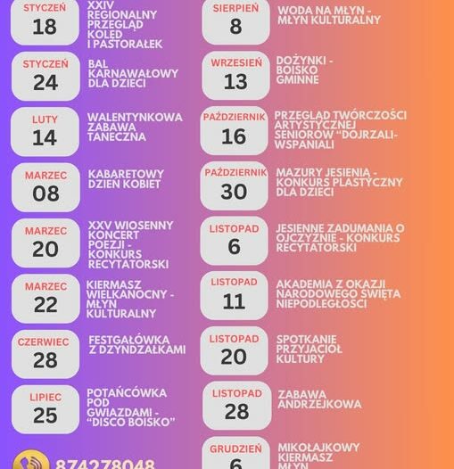 Zamieszczamy zestawienie wydarzeń planowanych na 2025 rok. Warto zanotować w kalendarzu, a szczególnie dzień Dożynek – 14 września 2025 (niedziela)!