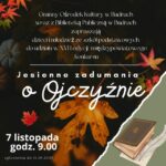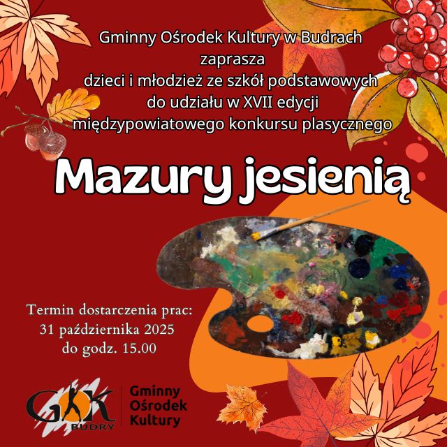 Share on Facebook Pin on Pinterest Tweet on Twitter Share on Google Plus Send via WhatsApp Send via E-Mail 20 października 2025 2025Aktualności XII edycja konkursu plastycznego Mazury jesienią – regulamin i karta zgłoszenia Pin it Polubienie 0 XII edycja konkursu plastycznego Mazury jesienią – regulamin i karta zgłoszenia Ocena: 0 / 5 (0głosy) Share on Facebook Pin on Pinterest Tweet on Twitter Share on Google Plus Send via WhatsApp Send via E-Mail Powiązane posty 2025 XVII edycja konkursu recytatorskiego „zadumania o ojczyźnie” 2025 regulamin i karta zgłoszenia 20 października 2025 2025 VII Przegląd Twórczości Artystycznej Seniorów Dojrzali wspaniali 2025 -regulamin i karta zgłoszenia 6 października 2025 2025 KOnkurs na jalepszą domową nalewkę – Dożynki 2025 3 września 2025 Czytaj dalej Poprzedni post XVII edycja konkursu recytatorskiego „zadumania o ojczyźnie” 2025 regulamin i karta zgłoszenia